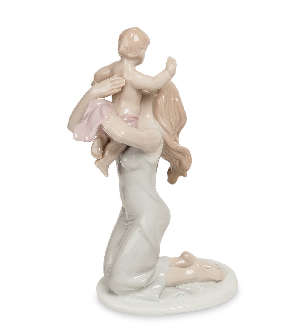Одну из счастливых мам изобразили создатели фарфоровой статуэтки «Девушка с ребенком». Девушка одета в светло-серое платье, стоит на коленях и держит на руках малыша, завернутого в розовое полотенце. Мама прижимает ребенка к груди, и оба они выглядят очень счастливыми.
