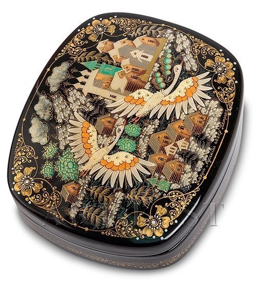 На черной крышке (черной краской покрыта вся внешняя поверхность коробочки) изображены старинные деревянные храмы с маковками куполов и золотыми крестами. Повсюду видны зеленые кусты и деревья, а также бурлящие потоки пены (скорее всего, автор изобразила небольшие реки, которые на севере встречаются очень часто). На переднем плане художница нарисовала двух гусей, совершающих сезонный перелет, а чуть выше – три серых кудрявых облака.