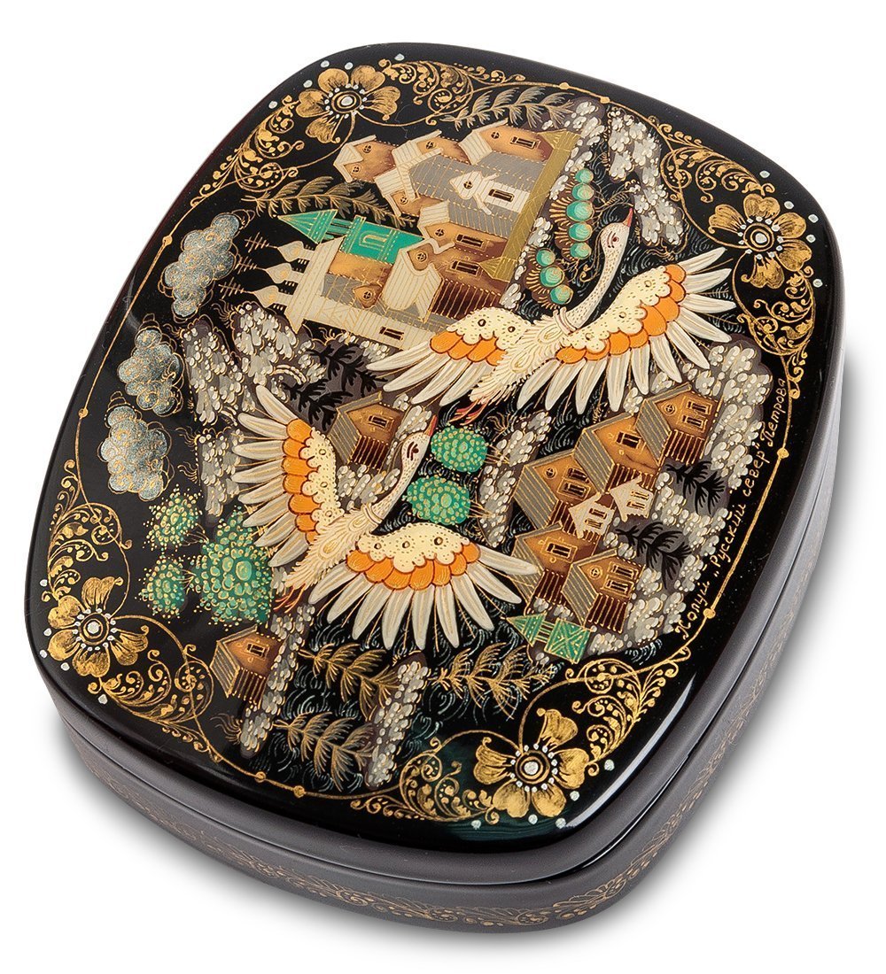 На черной крышке (черной краской покрыта вся внешняя поверхность коробочки) изображены старинные деревянные храмы с маковками куполов и золотыми крестами. Повсюду видны зеленые кусты и деревья, а также бурлящие потоки пены (скорее всего, автор изобразила небольшие реки, которые на севере встречаются очень часто). На переднем плане художница нарисовала двух гусей, совершающих сезонный перелет, а чуть выше – три серых кудрявых облака.
