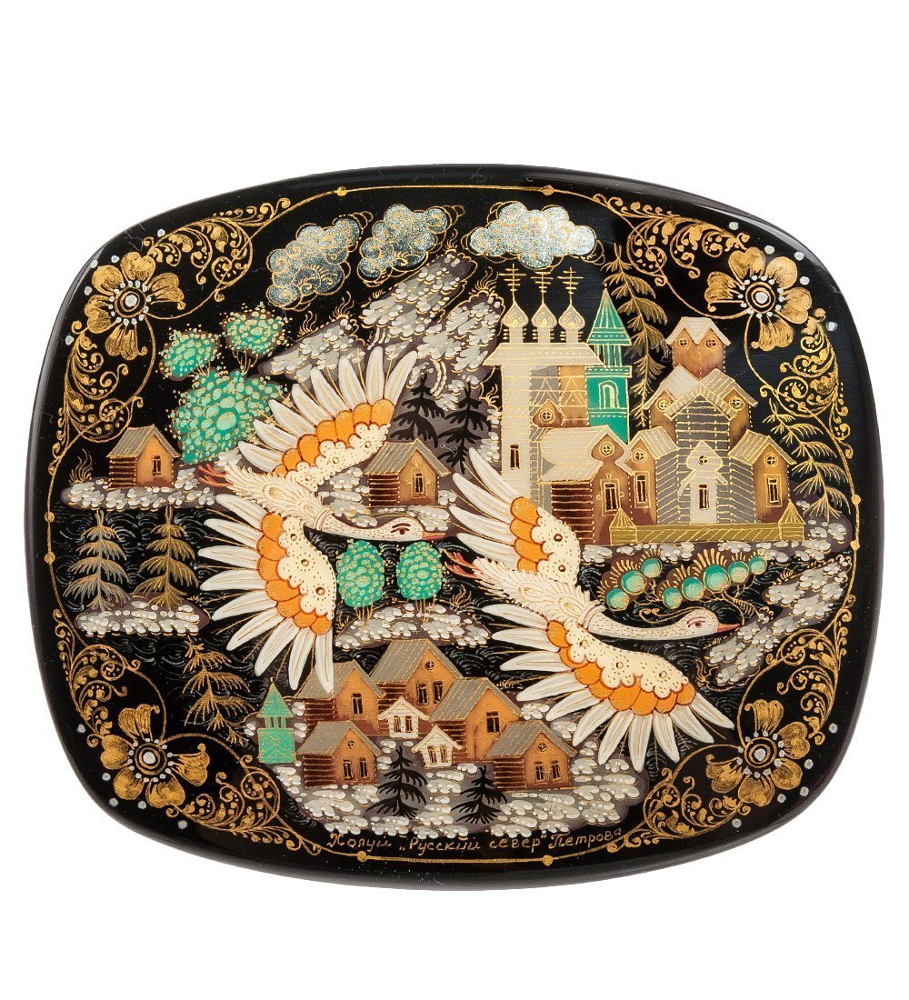 О том, как живет русский север, жители крупных городов России знают очень мало, а о том, какими они выглядели пару столетий назад, не имеют ни малейшего представления. Шкатулка «Русский север», раскрашенная в стиле холуйской миниатюры оформителем Петровой, показывает, как выглядело таежное поселение три столетия тому назад.