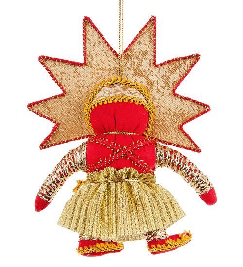 Левая половинка покрашена белой краской, правая – бежево-золотистой. На голове девочки серо-золотой кокошник в форме звезды, красная блузка, золотистая юбочка и красные башмачки. Тельце девочки перевязано множеством золотистых лент, добавляющих кукле блеск.