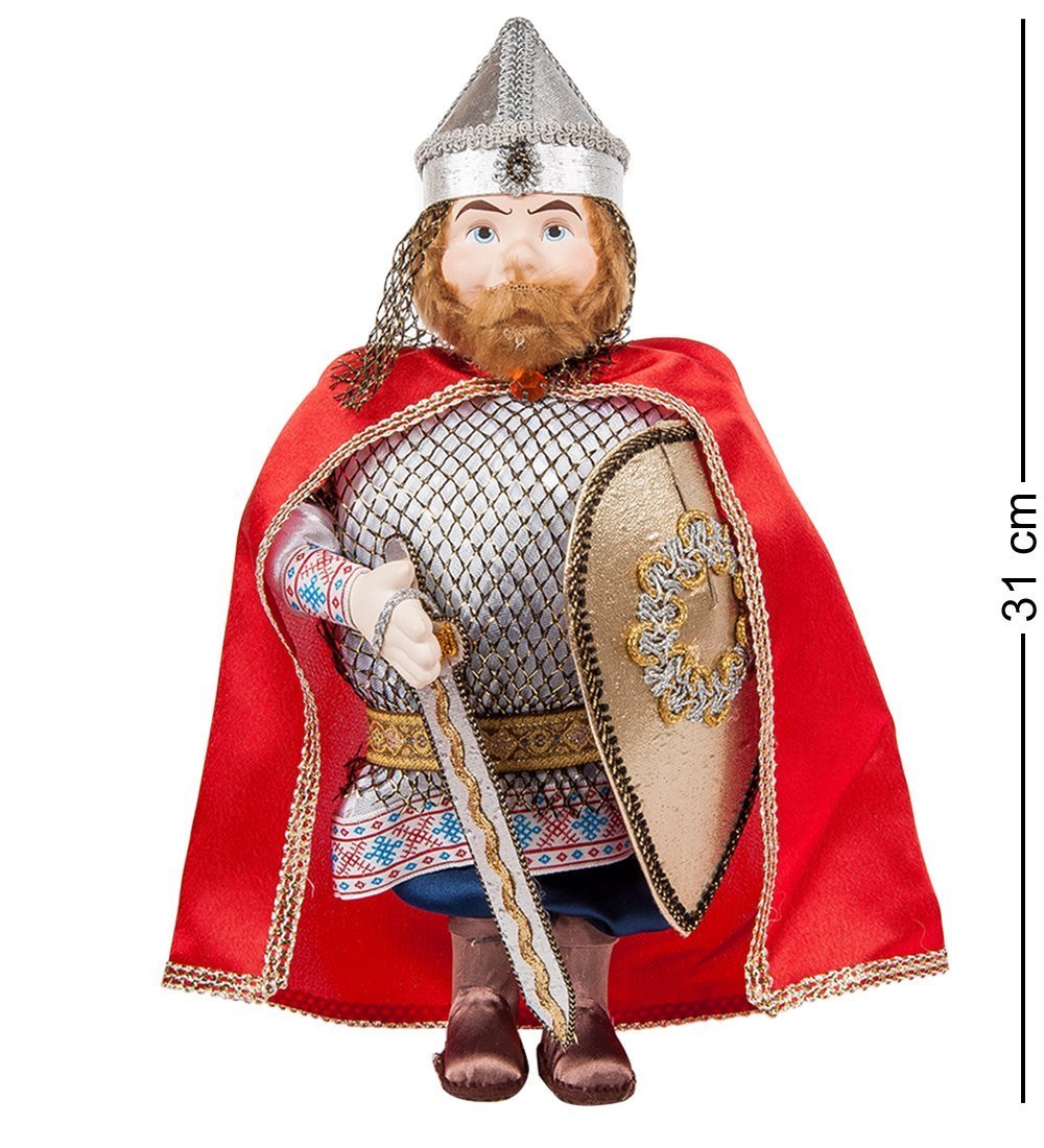У Куклы есть и накидка обшитая золотом, и меч со щитом, и кольчуга, и шлем. Густые брови и борода, голубые глаза, полные доброты, украшают лицо воина, которое сделано из бисквитного фарфора. Неординарный подарок коллекционеру, или любителю русской культуры.