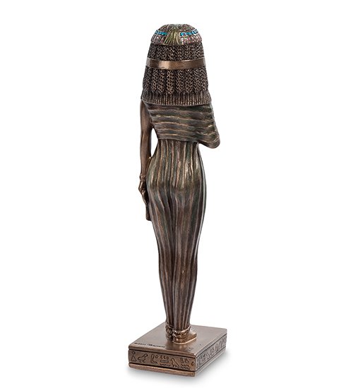«Египетская богиня» молода и привлекательна; как и большинство восточных женщин, Богиня имеет небольшие стопы ног и худощавое телосложение. Правильные черты лица и спокойный взгляд говорят о необычном происхождении и серьезной миссии. Классический наряд, который в Древнем Египте носили наделенные властью, скромен, но отличается особым изяществом. Фигурка сделана из полистоуна и раскрашена в медный цвет, отдельные элементы одежды окрашены синим.