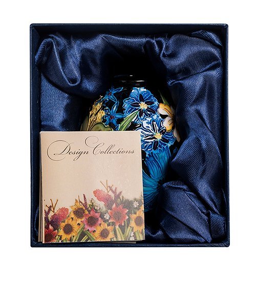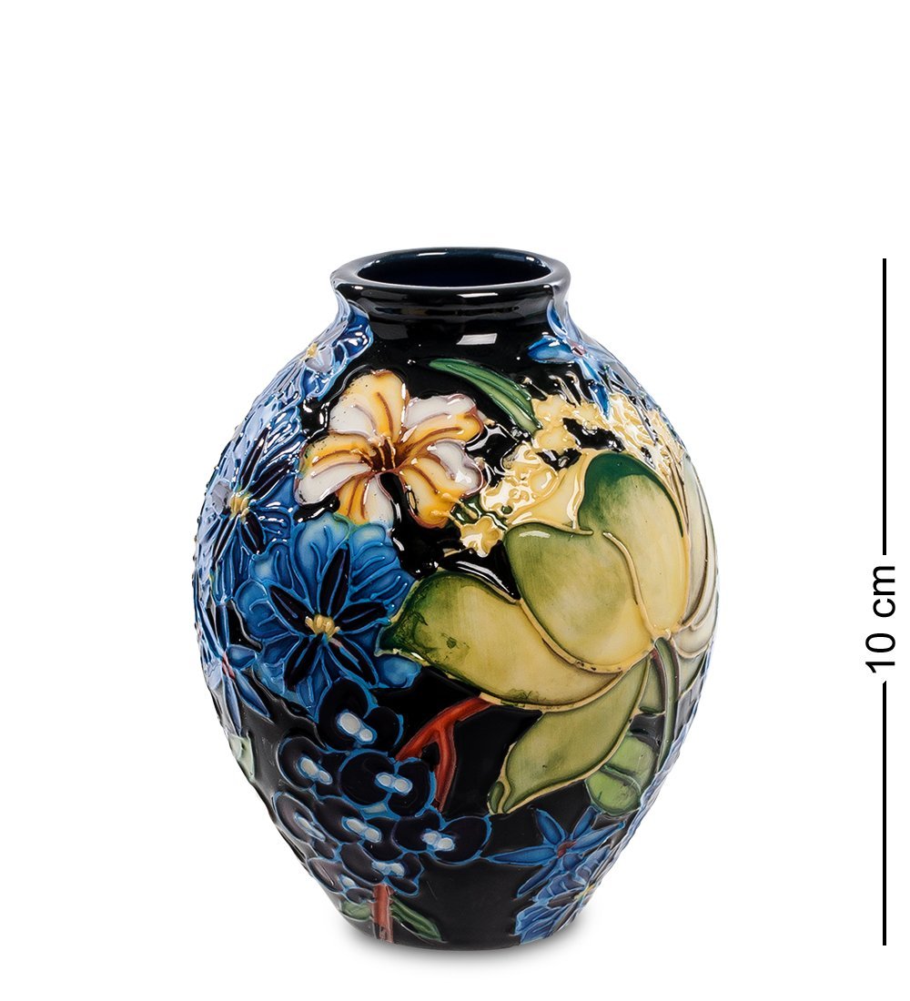 Вазочка небольшая (ее высота – 10 сантиметров). Лучше всего она будет смотреться на журнальном столике или на кухонном столе. У вазы классическая форма бочонка, и в нее вполне можно поставить небольшой букетик полевых цветов, а также искусственные цветы небольшой высоты. Художник покрыл вазу черной краской, а на ее фоне нарисовал несколько разноцветных бутонов. Лучше всего маленькая черная ваза будет сочетаться с темной деревянной мебелью, а также с современной мебелью черного цвета.