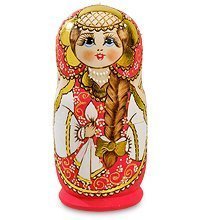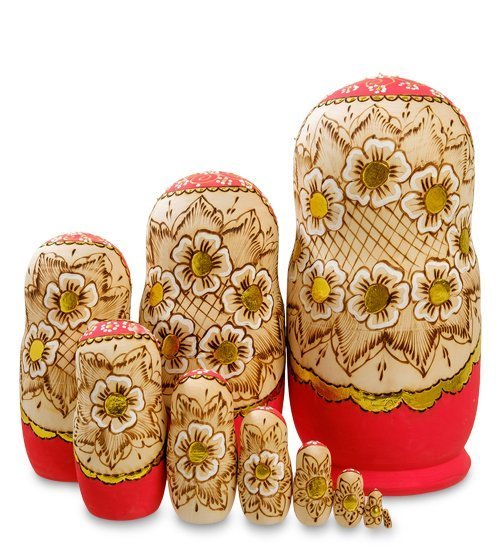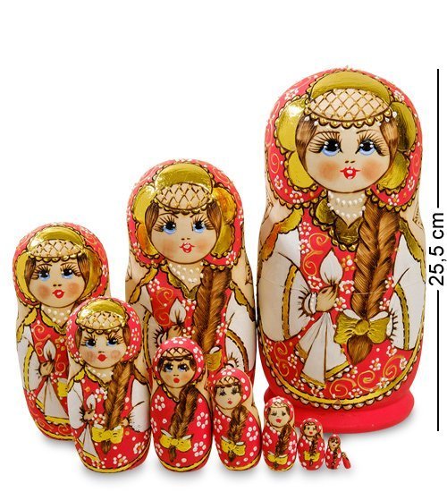 Как и многие другие комплекты матрешек, комплект «Дарья», состоящий из десяти деревянных куколок разного размера, украшен изображением молодой русской красавицы в классическом национальном костюме. На головах девушек красуются золотисто-фиолетовые кокошники, украшенные по бокам золотыми и белыми точками-бусинами.