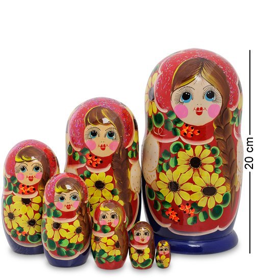 Комплект матрешек «Любаша» из семи предметов изображает русскую девушку с длинной каштановой косой. На ней серый кокошник, а ее наряд украшен листьями, ягодами и цветами. Любаша любит ромашки, и собрала целую коллекцию этих полевых цветов. На матрешках также можно заметить спелые орехи, покрытые россыпью золотистого песка.