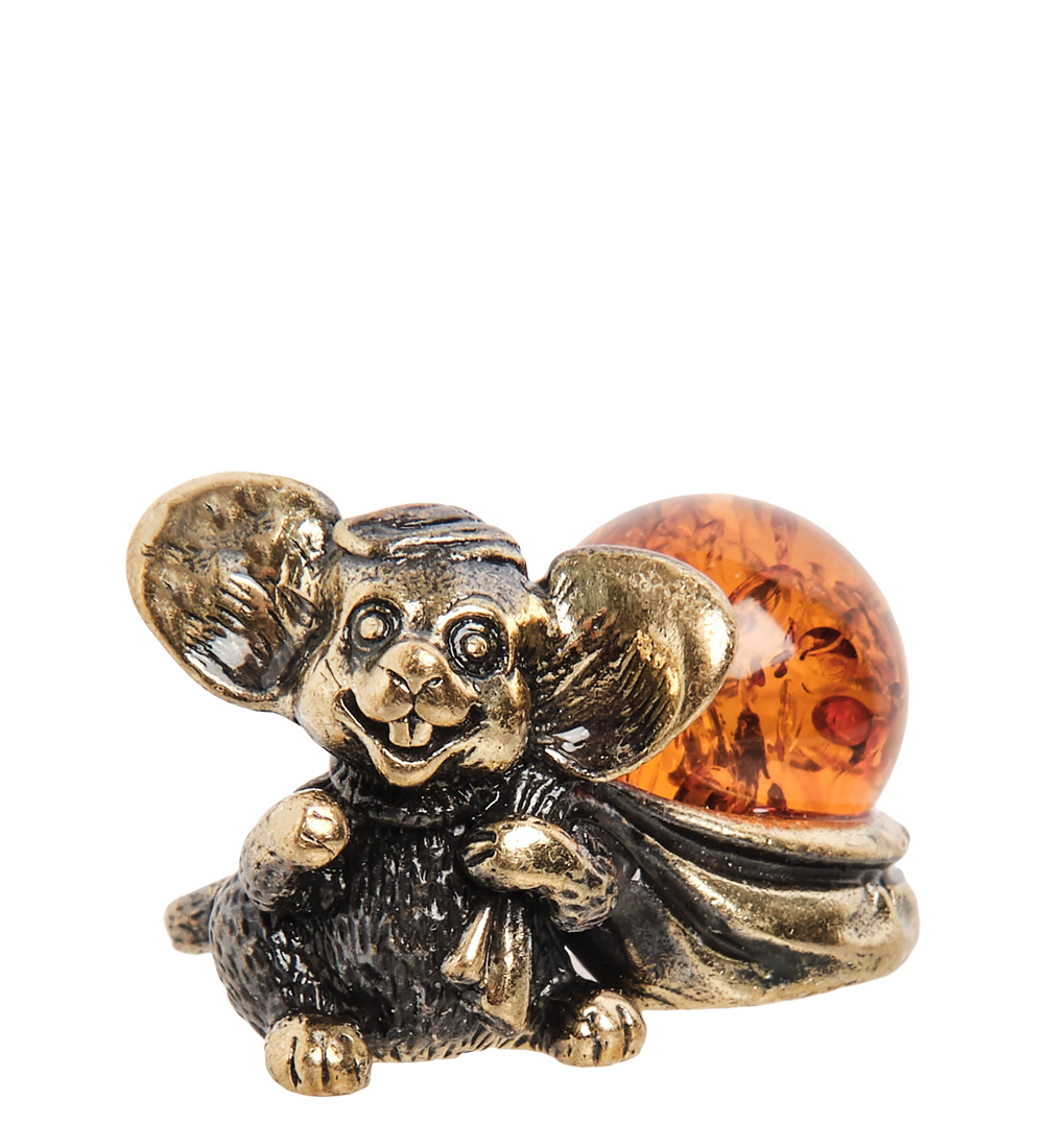 Довольный мышонок с мешком, содержащим сделанное из янтаря нечто круглое, напоминающее сырный шарик, очень доволен собой: ему удалось припасти еды минимум на месяц сытой жизни. На голове мышонка небольшая шапочка, а в левой лапке – большой мешок, содержимое которого расположено за спиной.