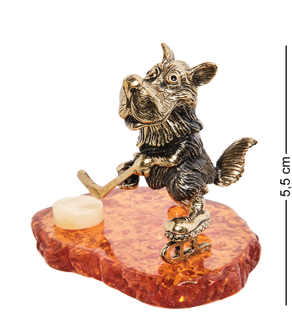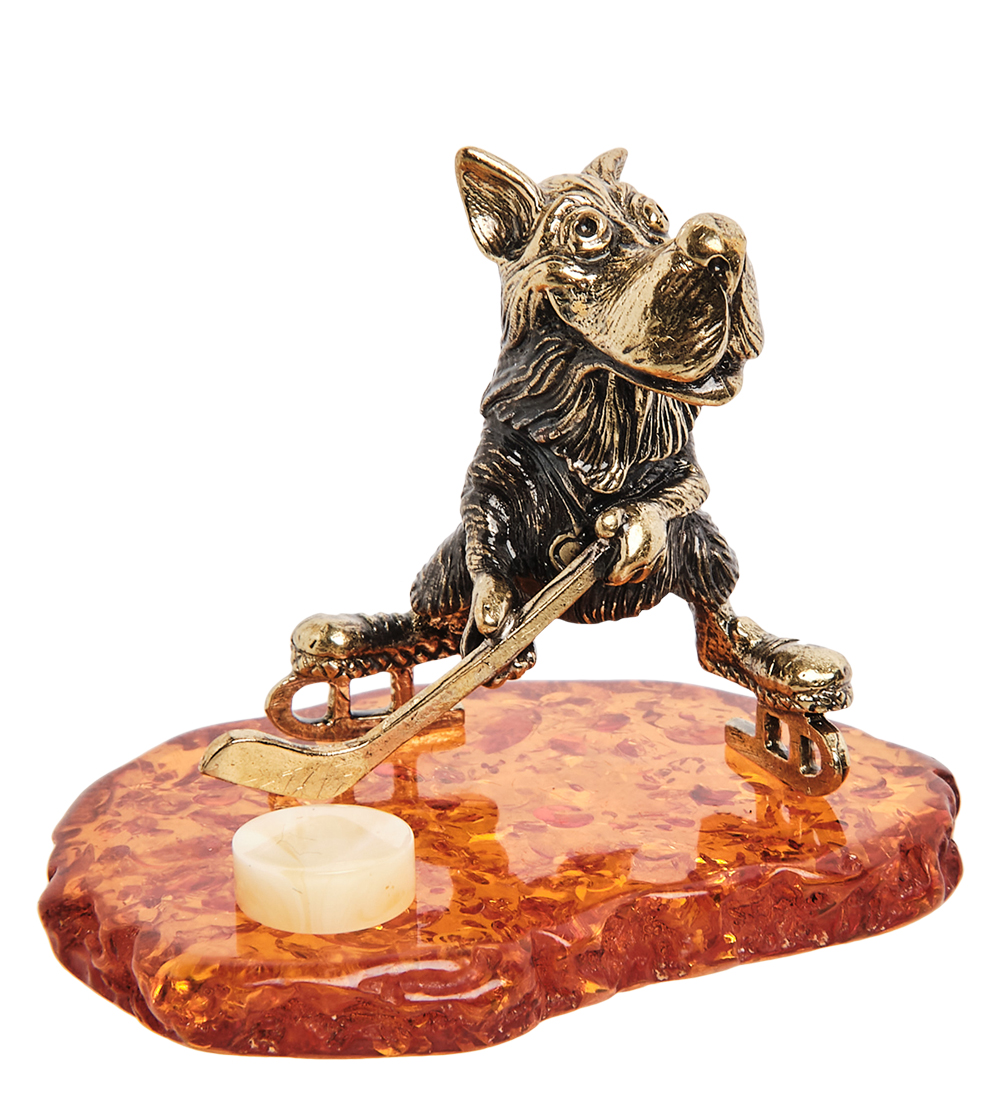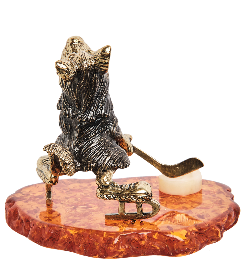 Миниатюрный «Волк хоккеист», сделанный из латуни и янтаря, многим напомнит волка из мультипликационного сериала «Ну, погоди!»: мультипликационный волк тоже не раз надевал коньки и становился на лед. Волк, воплощенный в статуэтке, выглядит значительно добрее, хотя в его глазах горит хищный огонь – огонь спортивной победы.