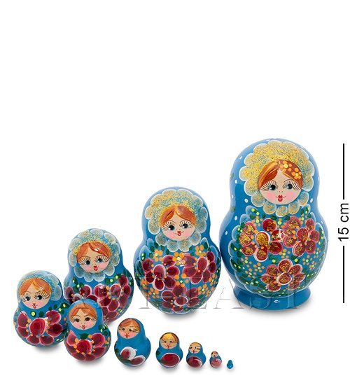 Комплект матрешек «Настюша» насчитывает десять предметов. Самая большая Настя имеет рост 14 сантиметров, а самую маленькую лучше рассматривать с близкого расстояния. Формой каждая матрешка комплекта напоминает два правильных шара, соединенных вместе, а главная, самая крупная девушка расположена на синей подставке в горошек.