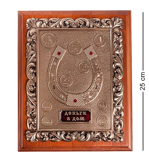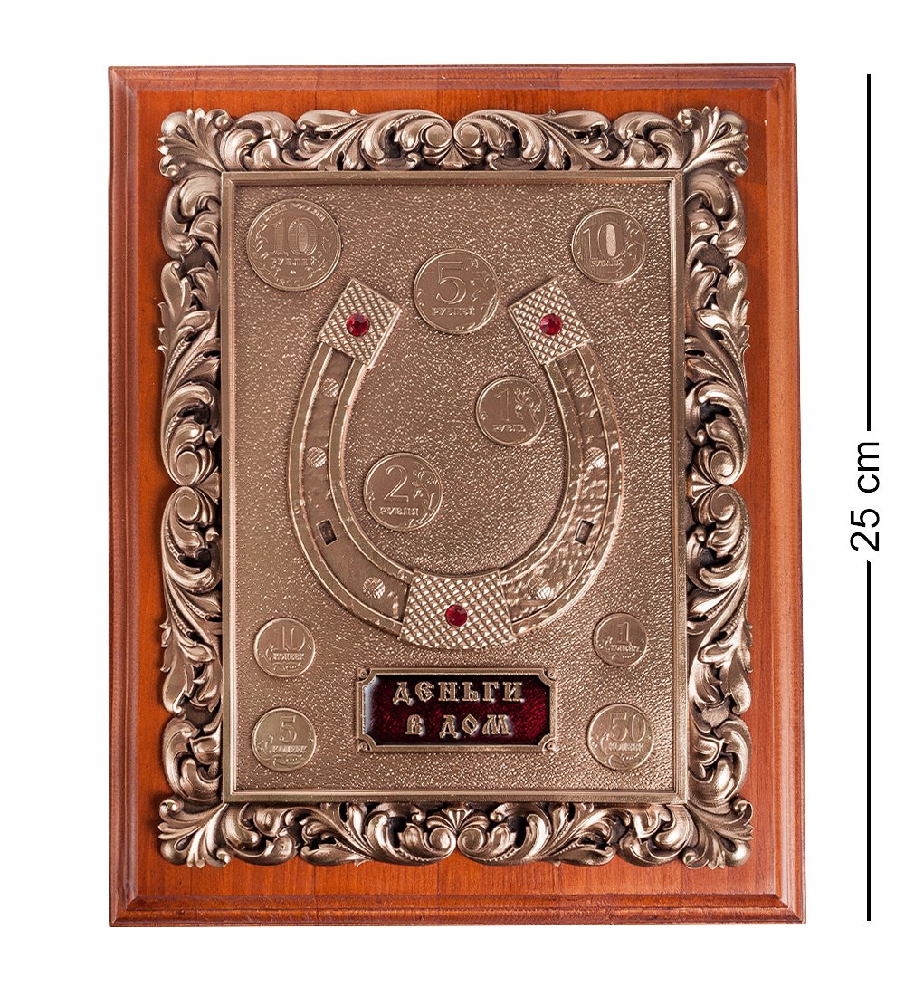 Настенное деревянное панно с объёмным изображением картины из меди с применением метода гальванопластики с нанесением ювелирной эмали. На подкове выложены стразы. На задней стенке панно есть подвес для крепления на стену.