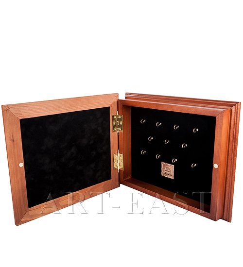 Деревянная ключница. Декоративная часть выполнена из меди методом гальванопластики и украшена кристалами сваровски. Внутри ключницы одиннадцать крючков, отделка бархат. На крышке магнит Крышка крепится к основанию при помощи двух латунных петель, на задней стенке подвесы для крепления ключницы на стену.