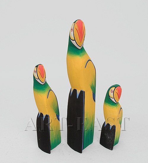 Все три птицы сделаны из дерева; их создали индонезийские мастера. Попугаи сидят на черных жердочках и имеют разную высоту: самый большой – 40 сантиметров, средний – 30, а самый маленький – 20 сантиметров вместе с подставкой. Попугаев можно подарить детям, и украсить ими интерьер комнаты с игрушками. «Зеленых попугаев» можно добавить в коллекцию необычных статуэток, или расставить птиц по всей квартире, если вашему жилью недостает ярких красок.