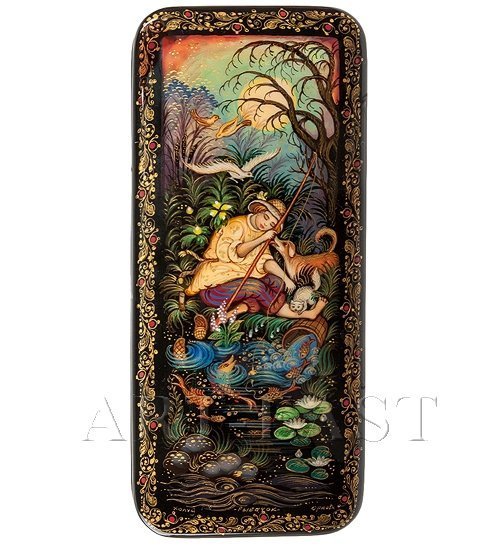 Длинная (17 сантиметров), прямоугольной формы шкатулка «Рыбачок» рассказывает нам о нелегкой судьбе сельского рыбака, утомленного ловлей хитрой рыбы и заснувшего под лучами летнего солнца. Большая длина шкатулки позволяет хранить в ней не только мелочь, но и длинные предметы (очки, перьевые ручки и даже кубинские сигары).