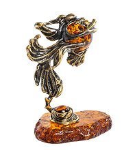 Фигурка сделана из латуни, а подставка, на которой расположилась любопытная рыбка – из янтаря. Глаза декоративной рыбы украшены синими камушками, а хвост – янтарным шариком. Голову рыбы создатель фигурки решил оформить в виде большого круглого шарика молочного цвета.