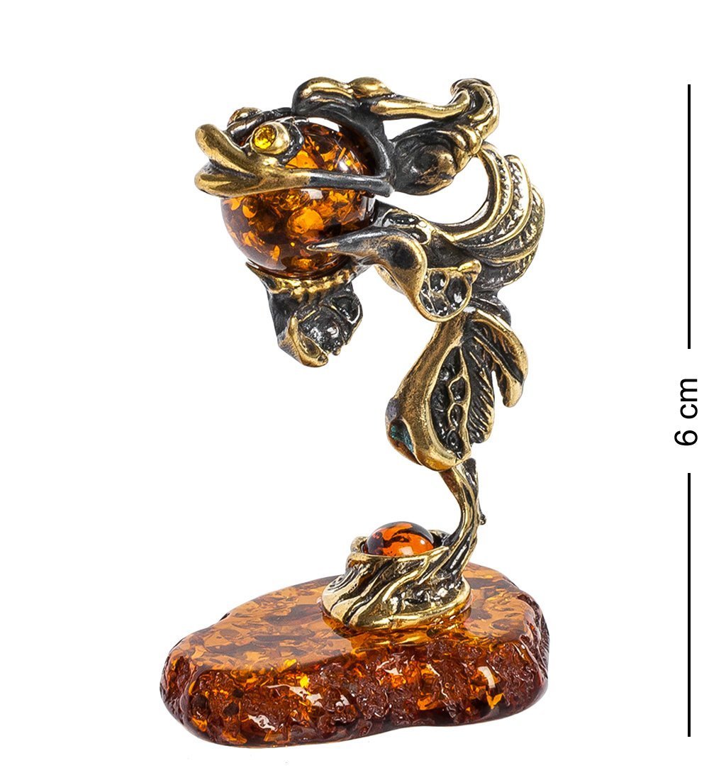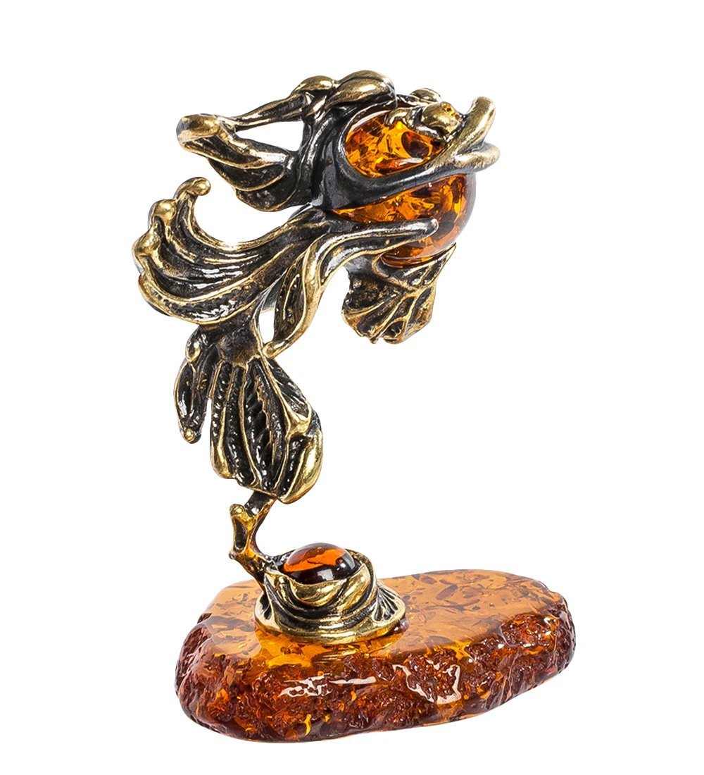 Фигурка сделана из латуни, а подставка, на которой расположилась любопытная рыбка – из янтаря. Глаза декоративной рыбы украшены синими камушками, а хвост – янтарным шариком. Голову рыбы создатель фигурки решил оформить в виде большого круглого шарика молочного цвета.