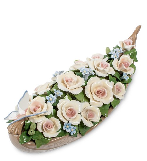 Деревянная старинная ладья – хороший символ удачного жизненного пути. А если она еще и загружена роскошными цветами, то путь этот будет красивым и благоухающим, а значит – счастливым. Это – прекрасный подарок: старинная лодка с композицией из чайных нежных роз, среди которых бледно-голубыми звездочками рассыпаны цветы фиалки.