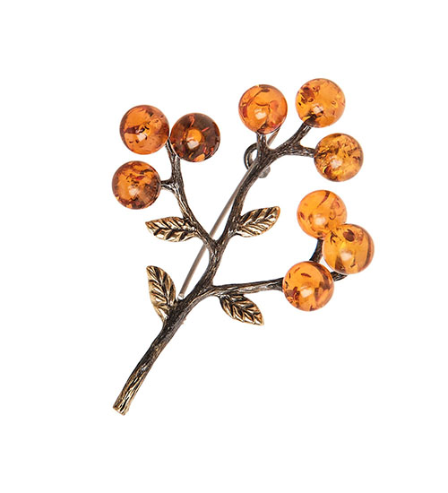AM- 887 Брошь «Веточка Калины» (латунь, янтарь)
