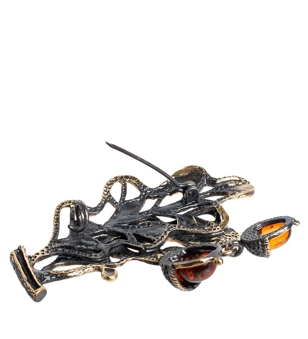 AM- 888 Брошь «Веточка Желуди» (латунь, янтарь)