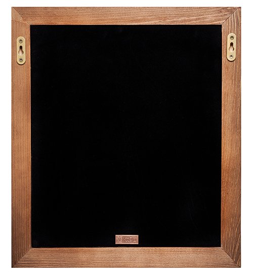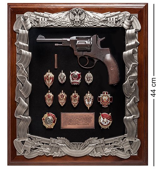 Деревянная ключница. Декоративная часть выполнена из меди методом гальванопластики с последующим никелированием.На медной табличке выгравирован текст о представленном оружии. На знаки нанесены ювелирные эмали. Внутри ключницы 14 крючков, отделка чёрный бархат. На крышке магнит. Крышка крепится к основанию при помощи двух латунных петель, на задней стороне подвесы для крепления на стену.