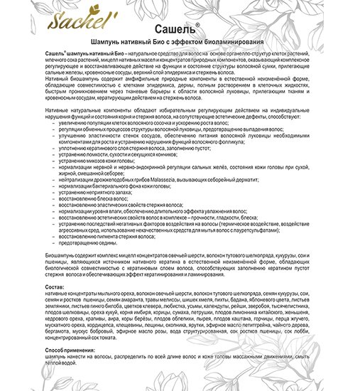 Сашель® шампунь нативный Био – натуральное средство для волос на основе органелло-структур клеток растений, млечного сока растений, мицелл нативных масел и концентратов природных компонентов, оказывающее комплексное регулирующее и восстанавливающее действие на функции и состояние структуры волосяной сумки, прилегающие сальные железы, кровеносные сосуды, верхний слой эпидермиса и стержень волоса.