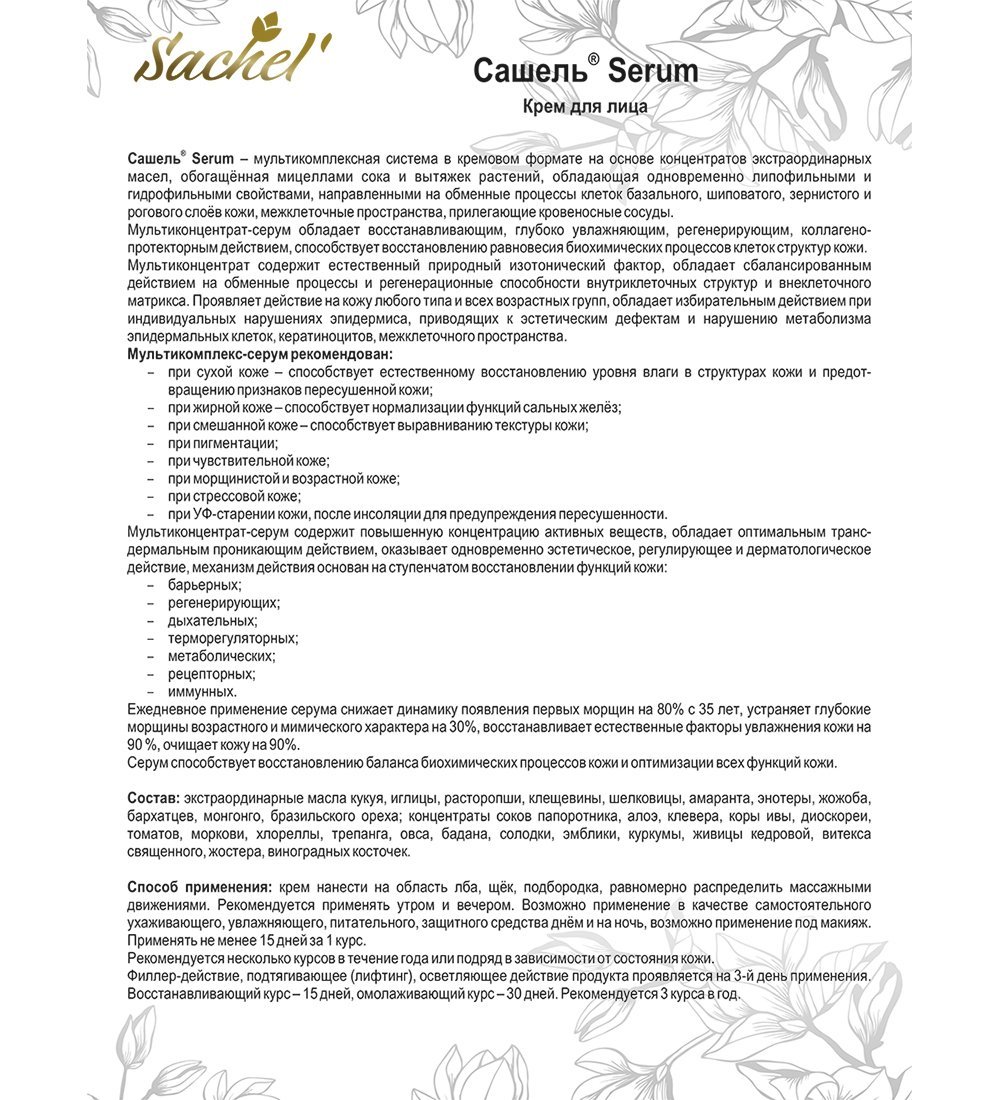 Сашель® Serum крем-коллоид – натуральная формула на основе меристематических клеток активных структур растений и концентратов природных компонентов, направленная на снижение активности сальных желёз, устранение воспалительного процесса кератиноцитов, предотвращение комедоногенеза и акнегенеза, сопутствующих патологичных состояний кожи, связанных с нарушением бактериального фона, снижением защитных функций кожи, нарушением барьерной функции кожи.
