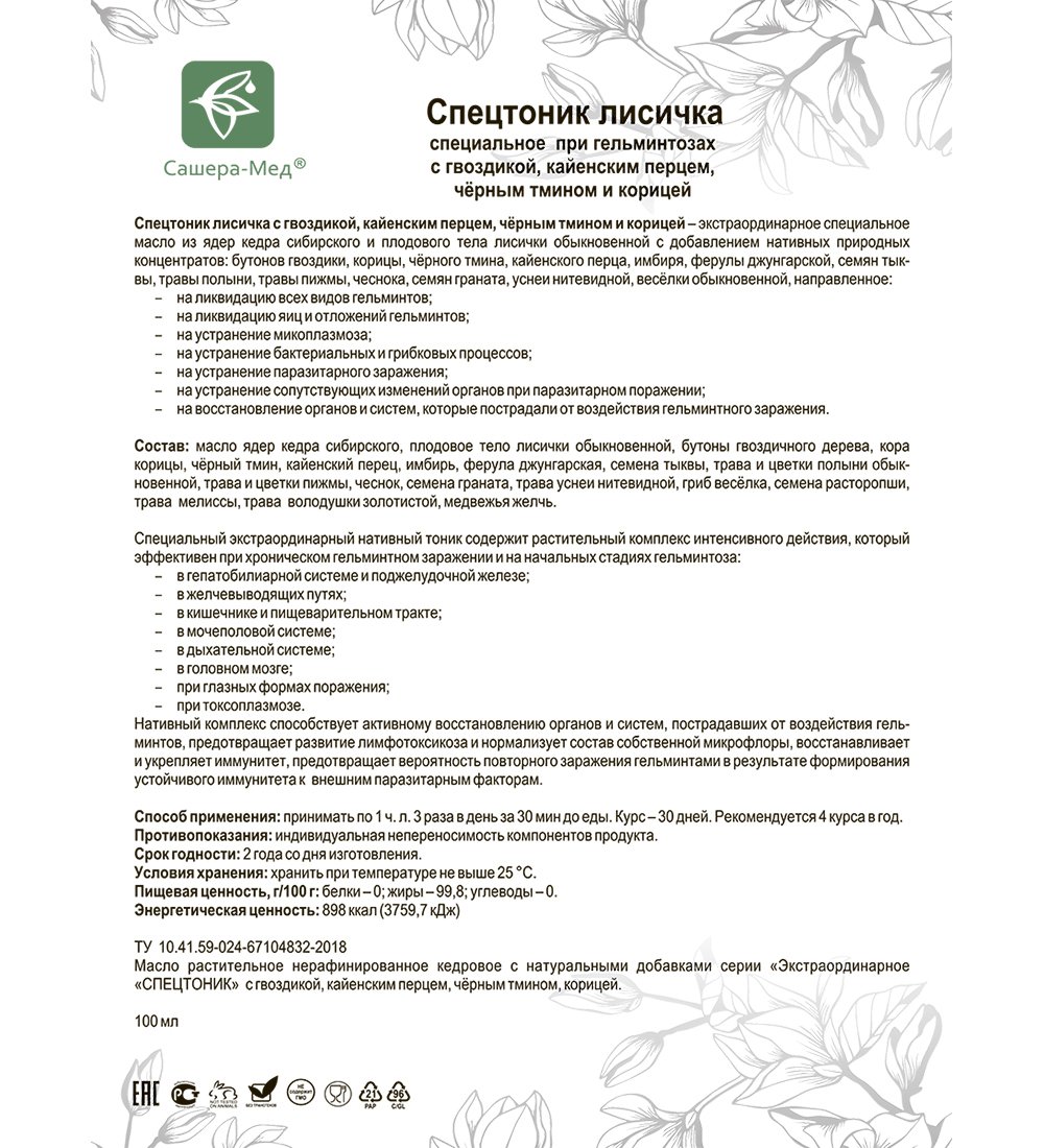 MED-14/06 «Спецтоник» Лисичка с гвоздикой, кeнийским перцем, чёрным тмином и корицей, 100 мл