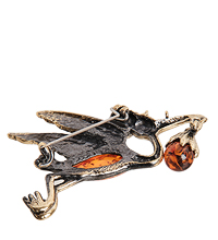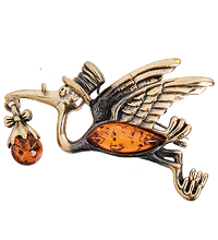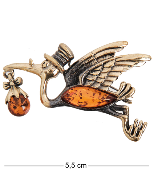 AM-2313 Брошь «Аист с младенцем» (латунь, янтарь)
