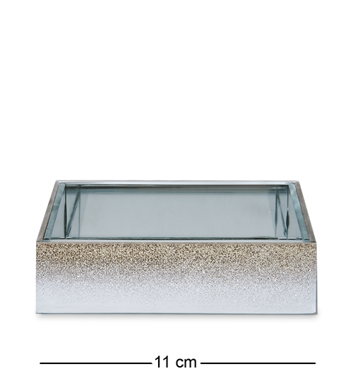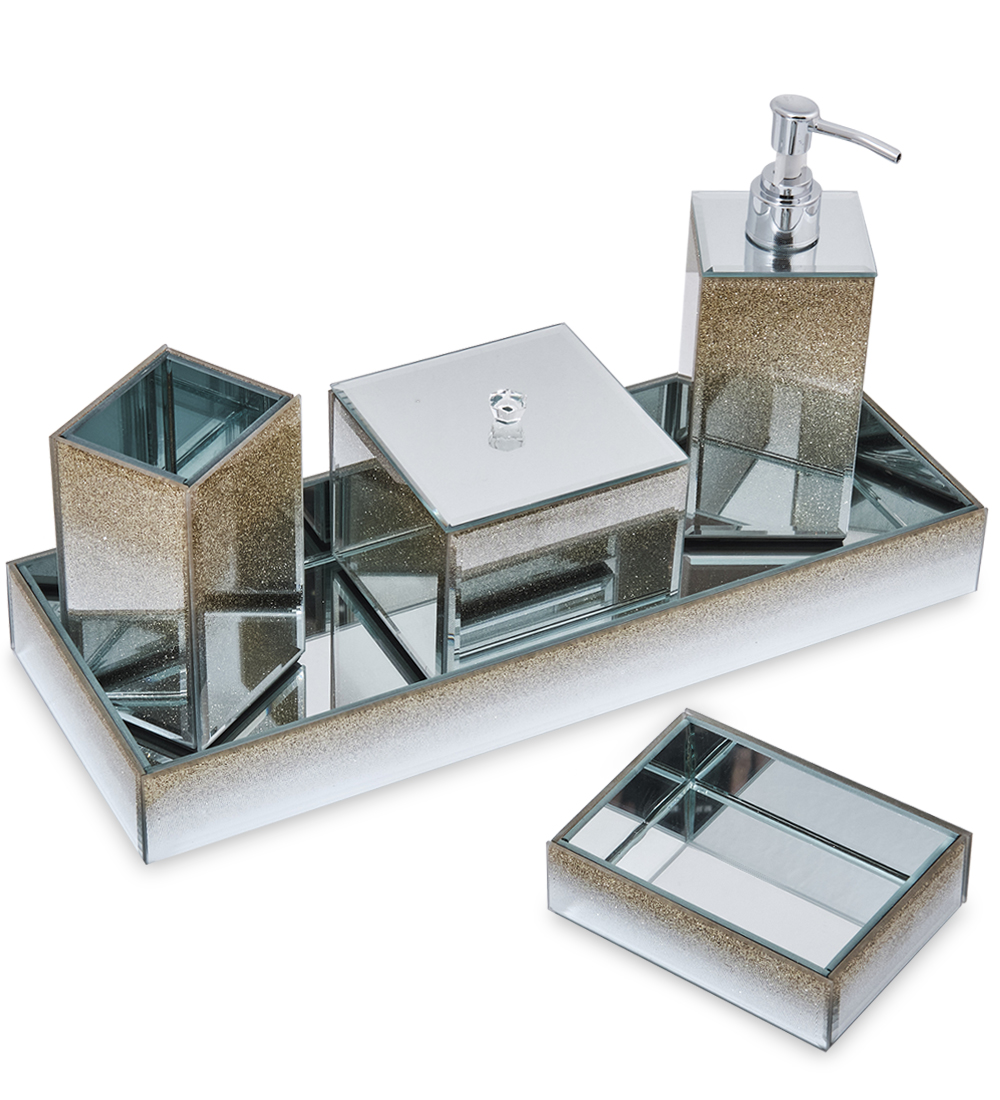 Материал: стекло (зеркало) Подставка - 34х13х4 см, 835гр. Дозатор 6,5х5,5х17,5 см, 330 гр. Шкатулка - 9,5х9,5х9,5 см (высота с учетом ручки на крышке), 383 гр. Мыльница - 11,3х8,3х3 см, 220 гр. Стакан - 6,5х6х11,5 см, 410 гр.
