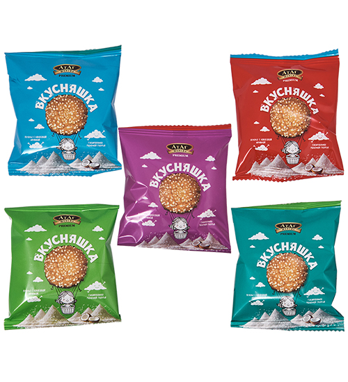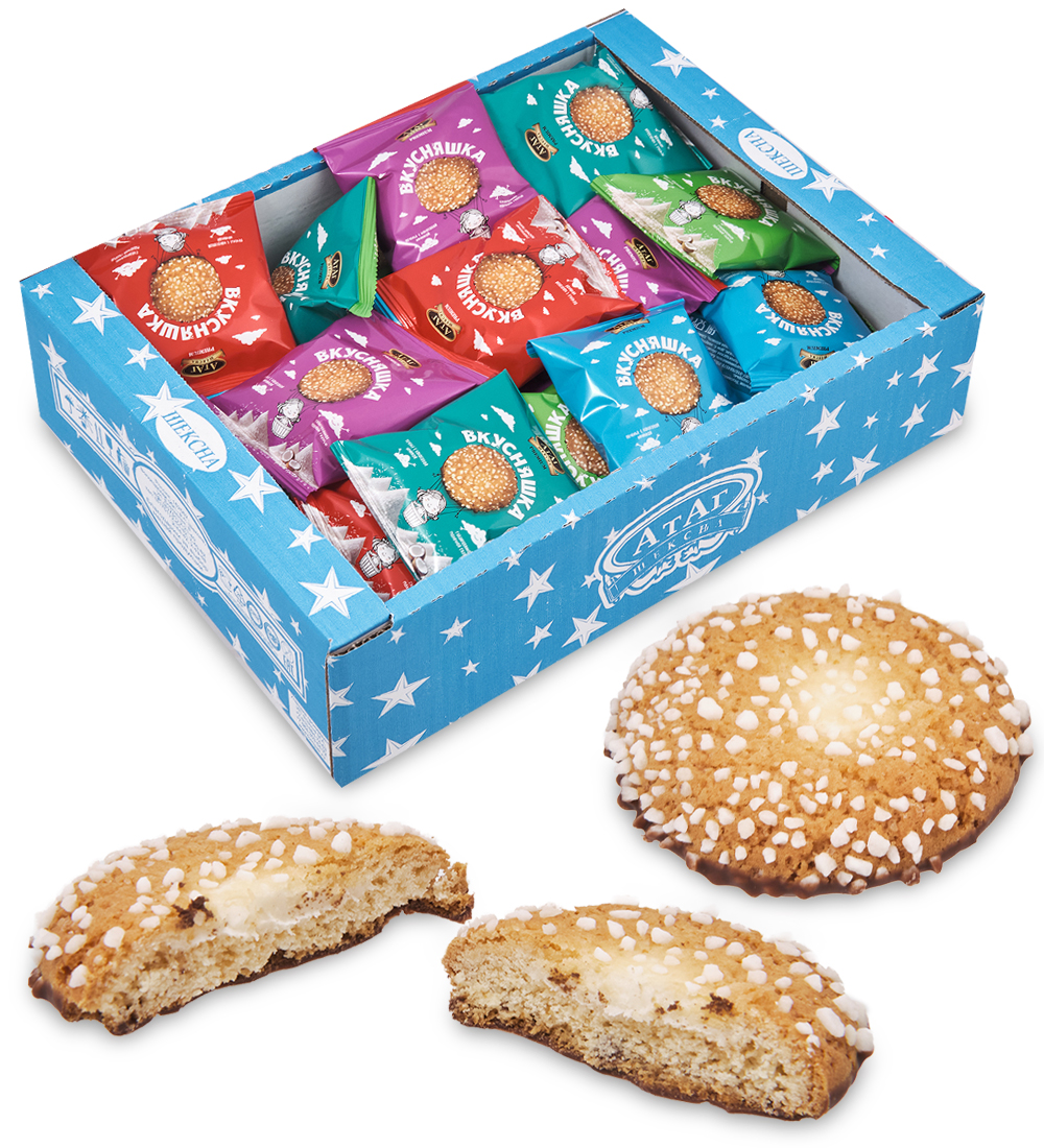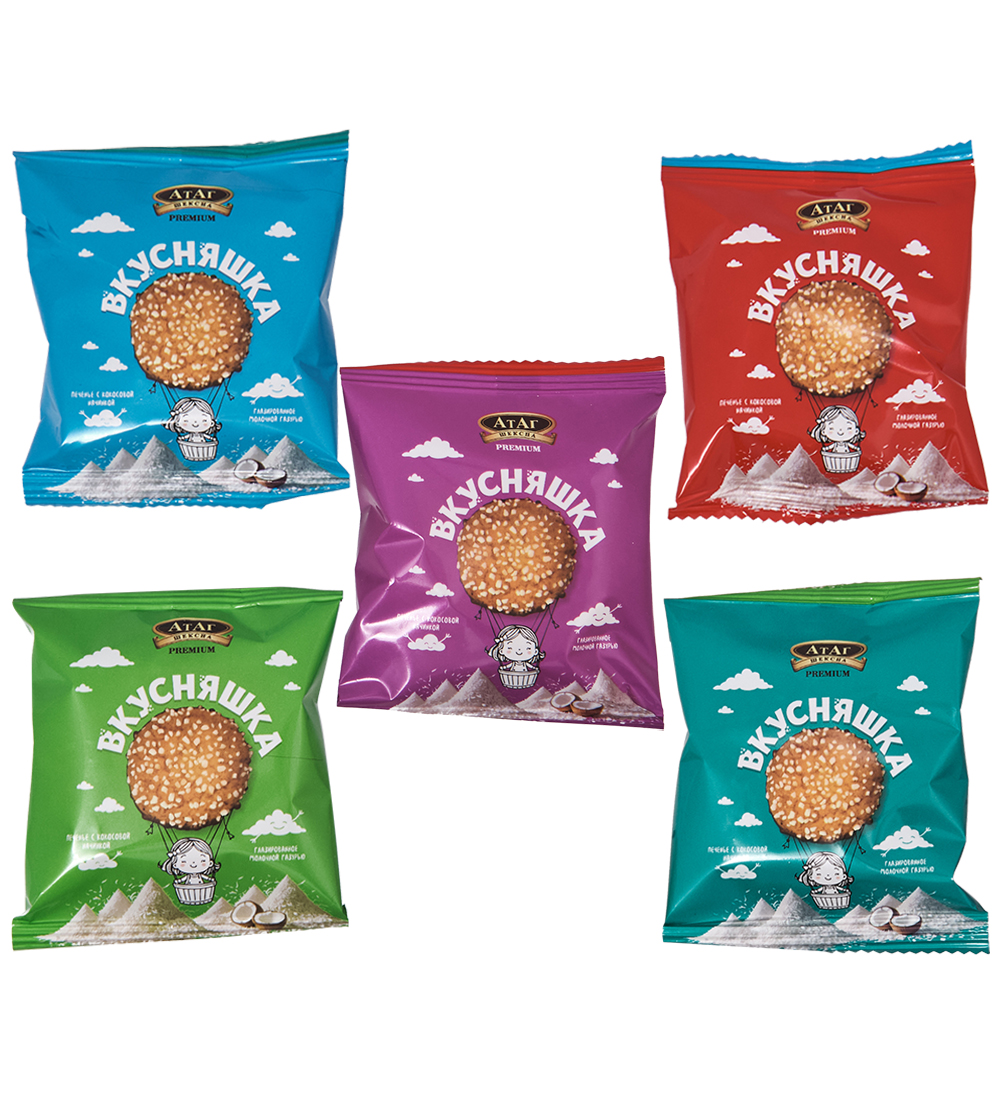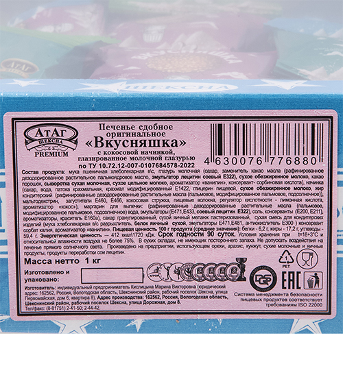 Материал: Мука пшеничная хлебопекарная в/с, сахар, маргарин (рафинированные дезодорированные растительные масла в натуральном и модифицированном виде, вода, соль, эмульгаторы: моно- и диглицериды жирных кислот, лецитин соевый, ароматизатор «масло», регулятор кислотности: лимонная кислота, краситель бета-каротин, антиокислитель: аскорбиновая кислота, ароматизатор), кокосовая стружка, вода питьевая, сироп глюкозы, разрыхлители: натриевые соли угольной кислоты (E 500), гидрокарбонат аммония (E 503), гидрокарбонат натрия (E 500), соль, ароматизатор «ваниль», консервант сорбат калия (E 202).