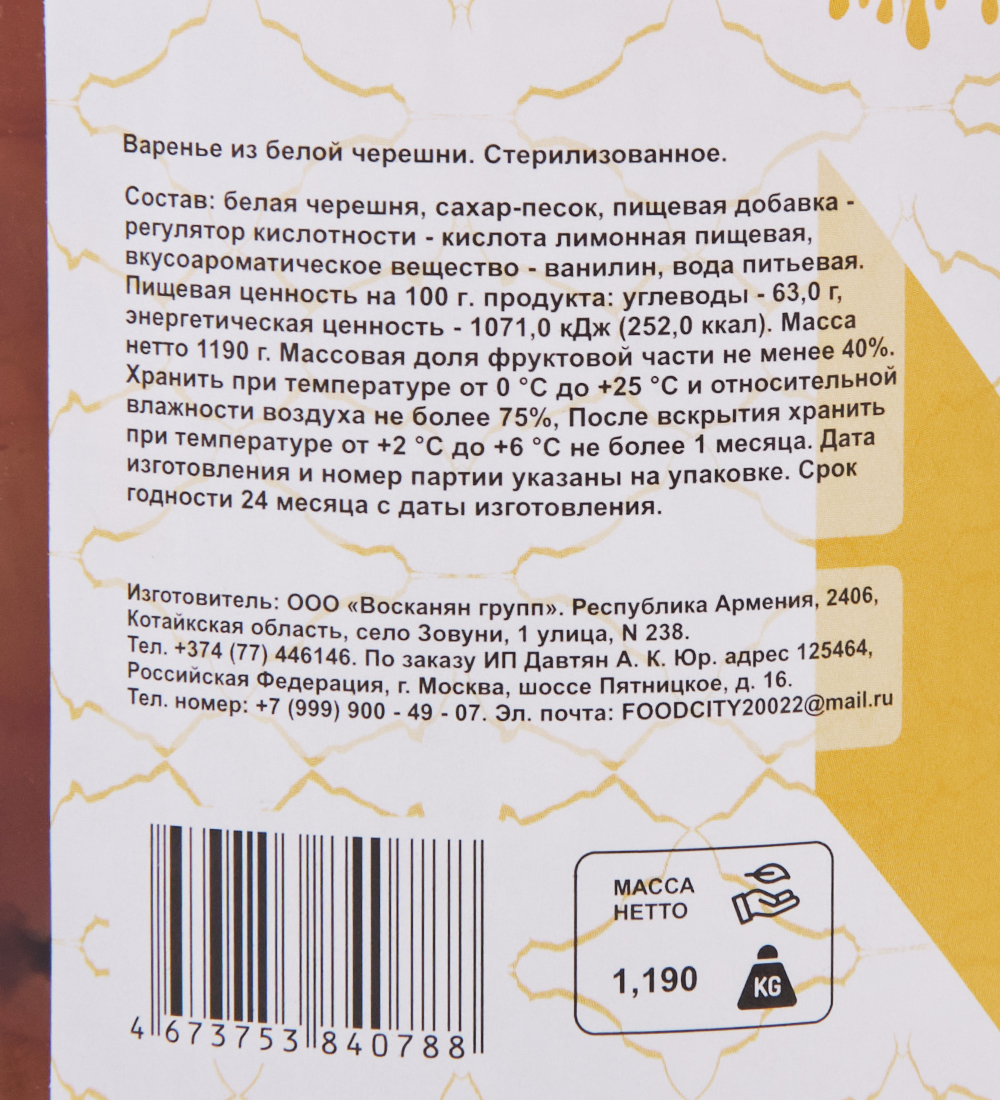 ARM-28/13 Варенье из Белой Черешни 1,2кг (ARMFOOD)