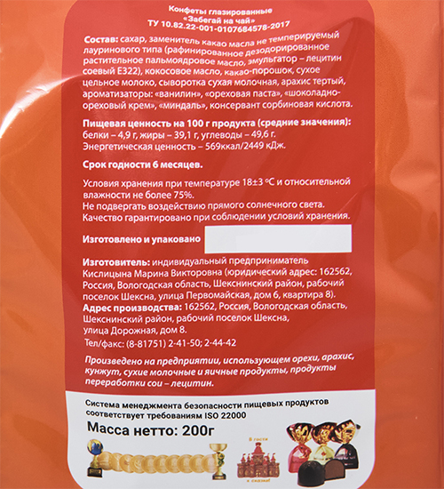 Материал: Сахар, заменитель какао масла не температурный лауринового типа (рафинированное дезодорированное растительное пальмоляровое масло, эмульгатор – лецитин соевый Е322), кокосовое масло, какао-порошок, сухое цельное молоко, сыворотка сухая молочная, арахис тертый, ароматизаторы: «Ванилинг», «ореховая паста», «шоколадно-ореховый крем», «миндаль», консервант сорбиновая кислота.