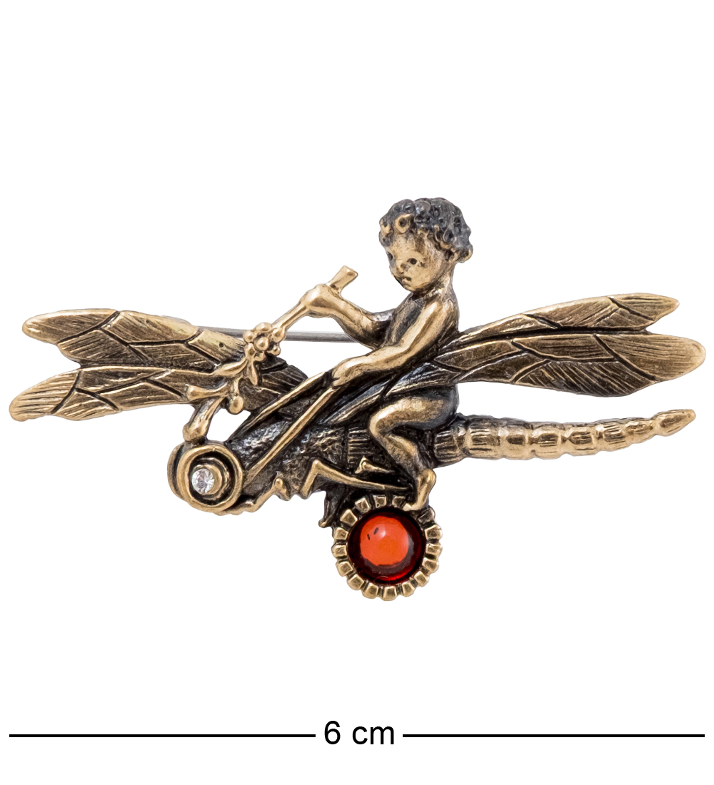 AM-4265 Брошь «Стрекоза и Ангел» (латунь, янтарь)