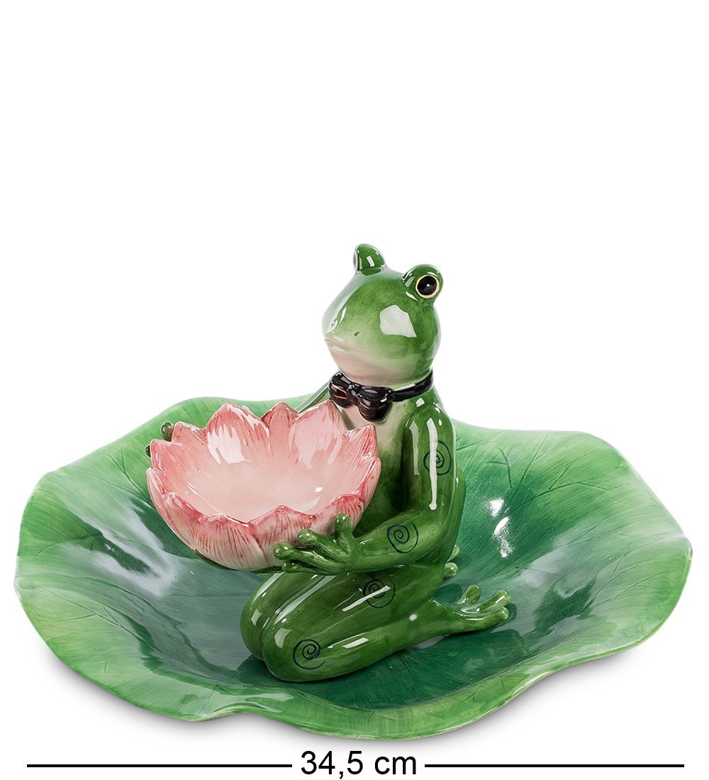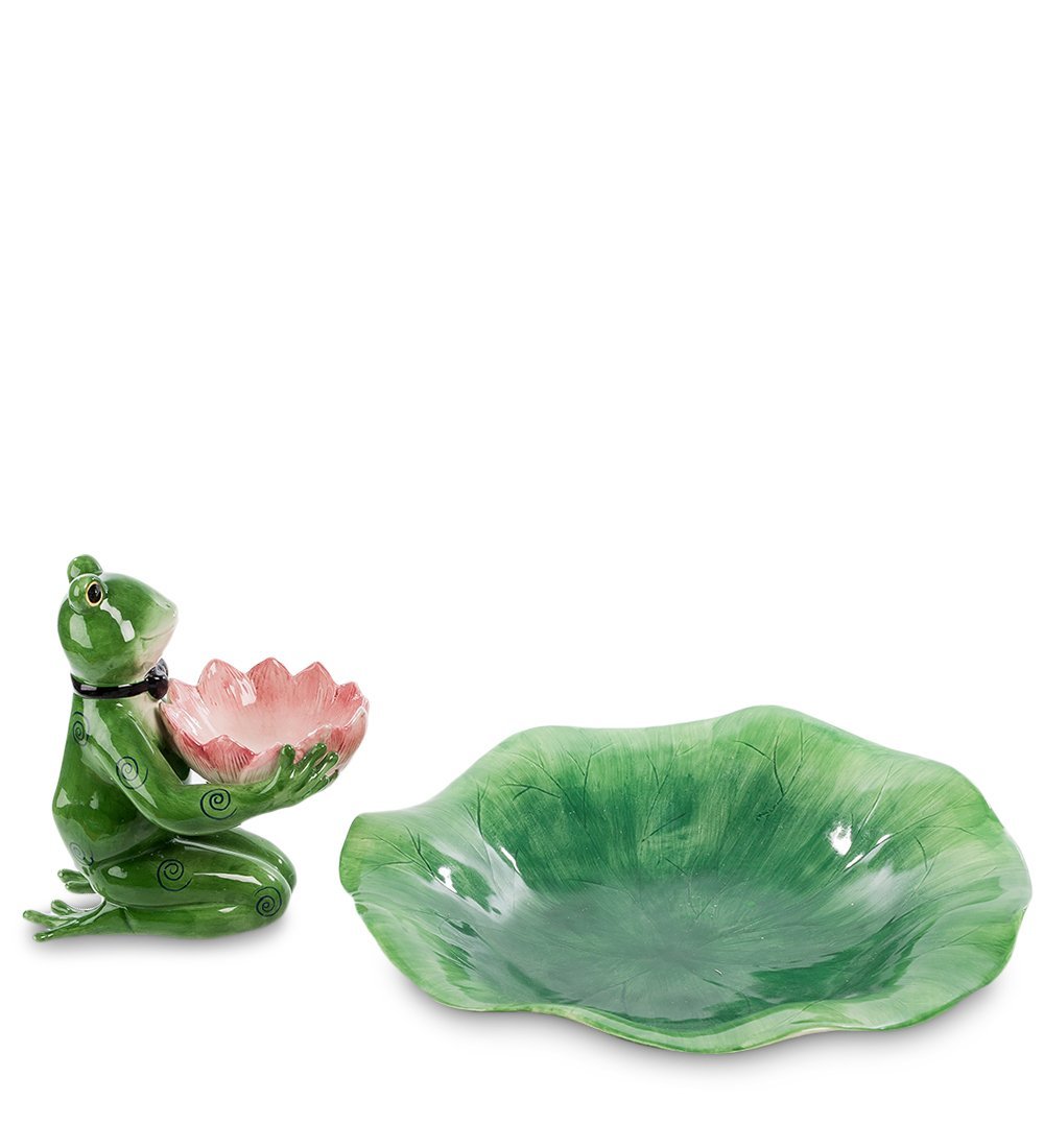 Шансы взять чей-то соус, поданный для другого блюда, минимальны! Удобно, практично, эстетично. Тарелка выполнена в виде листа лилии с углублением в центре. Розовый соусник-кувшинку держит лягушка в черной бабочке официанта. Весь набор (за исключением розовой кувшинки и галстука-бабочки) раскрашен в зеленые тона. «Лягушку» можно подарить на новоселье, а также на день рождения гурмана, знающего толк в соусах и приправах.