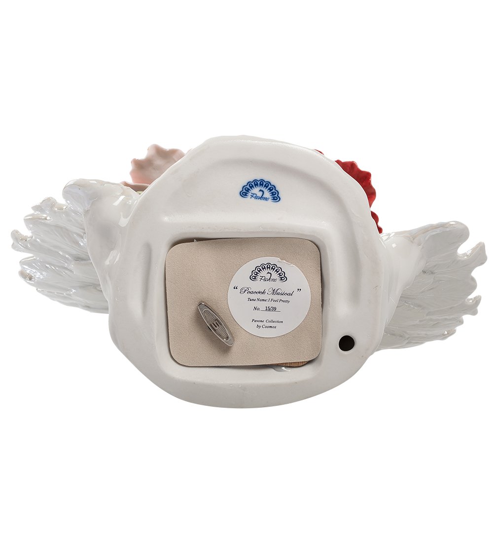 Автор музыкальной фигурки «Павлин» решил сделать привлекательность этой птицы еще более яркой и выразительной. Для этого он украсил павлиний хвост разноцветной и пышной цветочной композицией. Кроме того, невероятно изящная фарфоровая фигурка обладает еще одним достоинством – она способна наполнить ваш дом мелодичным и нежным звучанием.