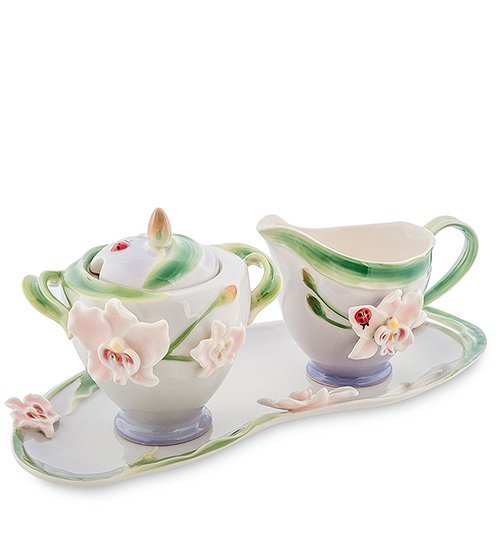 Сахарница усыпана нежно-розовыми Орхидеями, а цветовая гамма бело-голубых оттенков приятно радует глаз. Молочник мило украшен божьей коровкой. Нежный дизайн делает чайный набор неповторимым и желанным для коллекционеров. В комплекте небольшое блюдце для фруктов и сладостей к чаю.