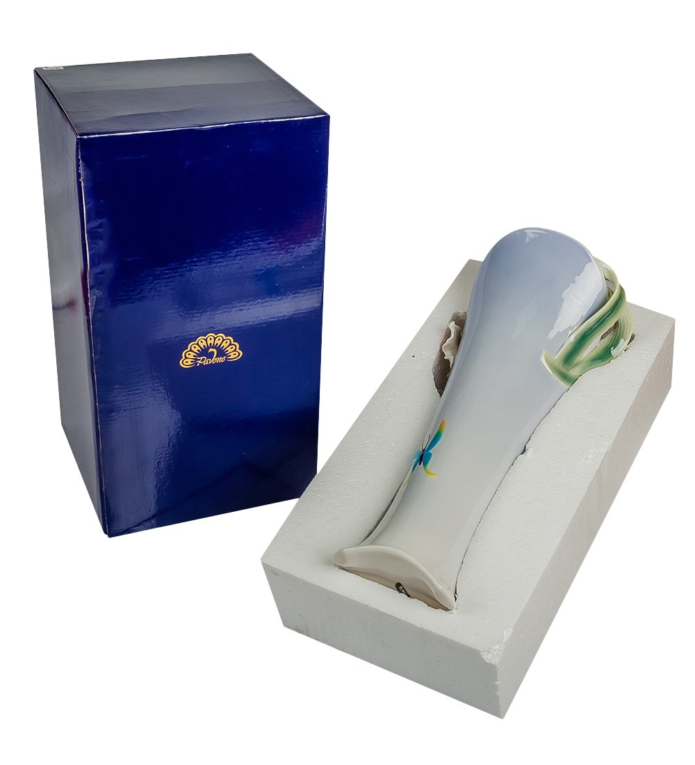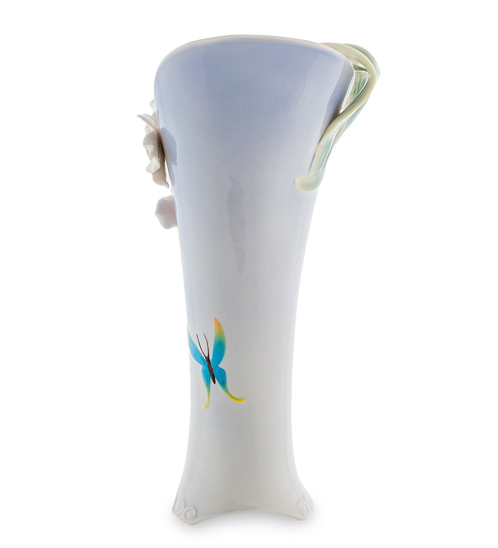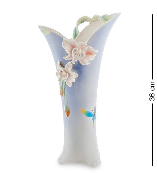 Шикарные белые орхидеи на голубом фоне ярко выделяются и добавляют особенные ноты очарования в общую композицию. Лепестки цветов приобрели видимую форму и плавными изгибами покрывают вазу. Она отлично украсит своим видом комнату и привлечет к себе внимание современным дизайном, нежной гаммой оттенков и ярко-голубой бабочкой сбоку.